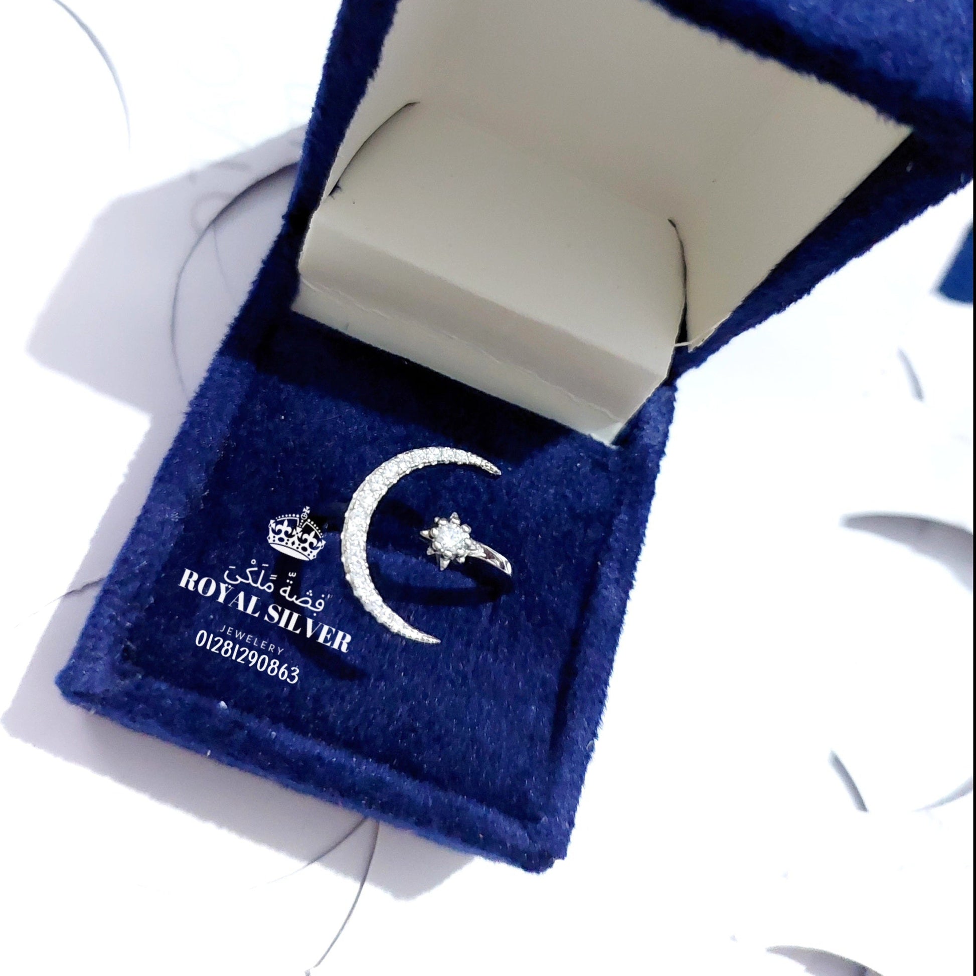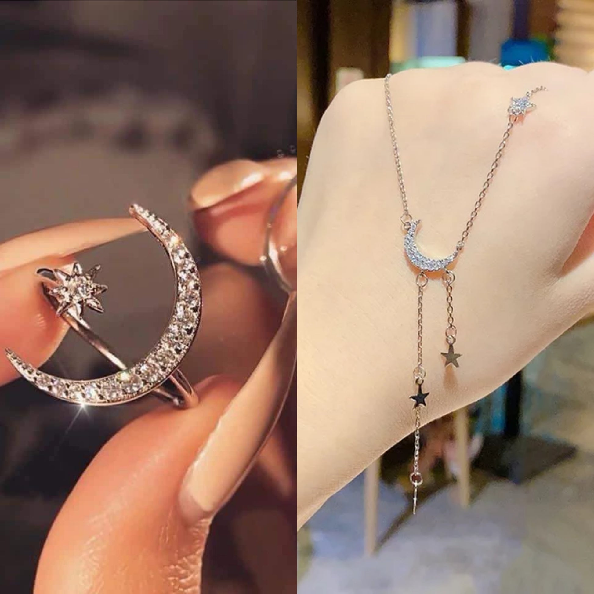 •طقم هلال الأنيق،  سلسلة وخاتم بمقاس حر مرصع بالزركون الأبيض شبه الماس.